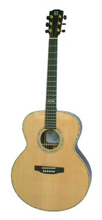 Nun erweitert Ayers die Palette seiner Akustikgitarren mit der MSR Medium Jumbo um ein weiteres Top-Modell. Die Verwendung massiver Hölzer und hauchdünner Lackschichten gibt dem Klang der MSR die Möglichkeit sich voll zu entfalten, ohne dass das Schwingungsverhalten durch störende Lackschichten oder Leimnähte beschnitten wird. Boden und Zargen sind aus massivem Palisander, die Decke aus massiver Sitka Fichte gefertigt. Der Klangcharakter der Ayers MSR ist kräftig und warm, dank der Jumbo-Bauform besitzt die Gitarre eine äußerst ausgewogene und durchsetzungsfähige Projektion . Auffällig sind die sorgfältig von Hand eingesetzten Abalone Einlagen rund um das Schallloch und im Binding, die der MSR ihre besondere Note verleihen. Jede Ayers-Gitarre wird mit einem umfangreichen Service-Paket ausgeliefert. Dieses beinhaltet einen extrem leichten Koffer (Softcase), ein digitales Hygrometer zur Messung der Luftfeuchtigkeit und einen Planet Waves Luftbefeuchter. Die unverbindliche Preisempfehlung für dieses Instrument inklusive umfangreichem Service-Paket liegt bei nur 1099,- Euro. |