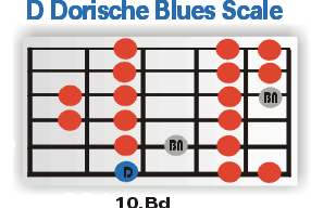 Die verwendete Tonleiter ist D-Dorisch. In Kombination mit der normalen D-Blues Scale macht der C-Dur Abkömmling richtig was her. Vielleicht ist dir die Skala auch schon mal unter dem Namen "Erweiterte Pentatonik" unter die Finger gekommen.