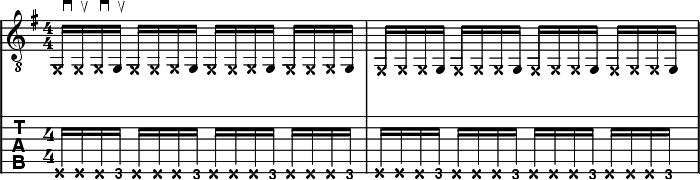 Kommen wir zu unserer ersten Studie. Um dir die Möglichkeit zu geben dich an den Umgang mit der Spieltechnik zu gewöhnen, beschränken sich unsere Experimente im Moment ausschließliches auf straightes "Sechzehnteln". Dabei wird nur ein Ton pro 16tel Gruppe klingend gespielt, alle anderen Noten werden abgedämpft.